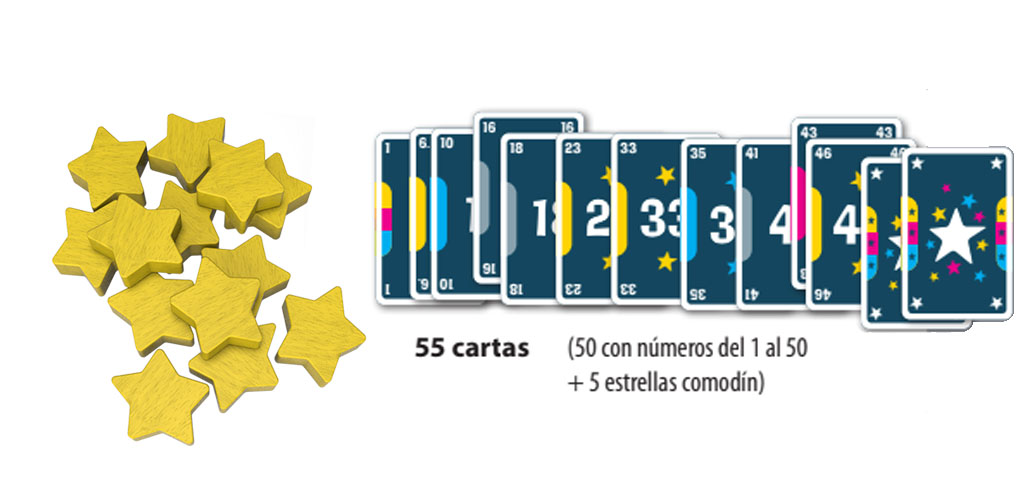 Se reparten 5 cartas a cada jugador y deberás ir bajando cartas. Hay 2 reglas muy simples, deberás bajar una carta más alta que la que se encuentre en el centro, la carta puede ser menor a la misma, solo si comparte el mismo color de estrella…